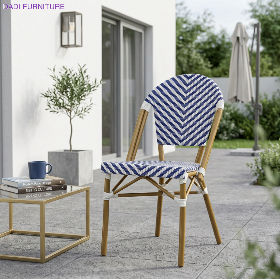 Gold Aluminum Outdoor Armchair French Bistro Design All Weather Rope Woven Seating for Hospitality